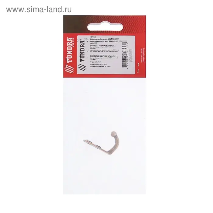 Крючок мебельный ТУНДРА TKO009, однорожковый, медь