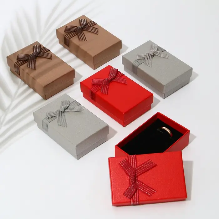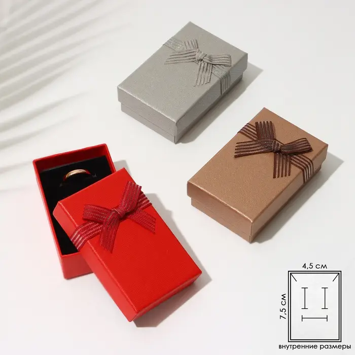 С нашими прекрасными коробочками любой подарок станет еще лучше и ярче. Футляр выполнен из прочного плотного картона. Оптимальный размер коробки 5*8см позволяет разместить разнообразные виды ювелирных изделий – от сережек до колье. Внутри каждой коробочки с крышкой есть чёрная бархатная подложка. С помощью специальных прорезей на подушечке можно аккуратно разместить и зафиксировать цепочки, гвоздики и перстни. А если убрать подложку, упаковка подойдет даже для часов с мягким плоским ремешком или на цепи.