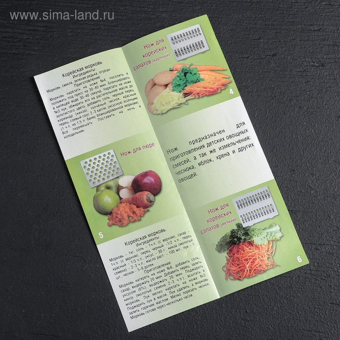 Овощерезка-терка изготовлена из пластика высокого качества, имеет эргономичную ручку и лезвия из нержавеющей стали, которые обладают коррозиестойкостью и сохраняют свою остроту в течение долгого времени. Она проста в использовании и легко моется, что делает ее идеальным инвентарем для любой хозяйки.