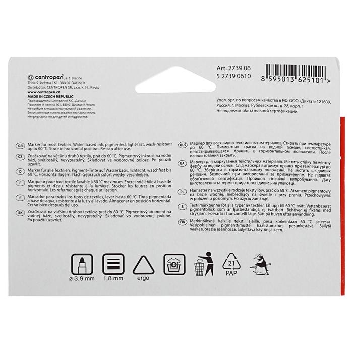 Набор маркеров для ткани 6 цветов 3.9 мм Centropen 2739, линия 1,8 мм