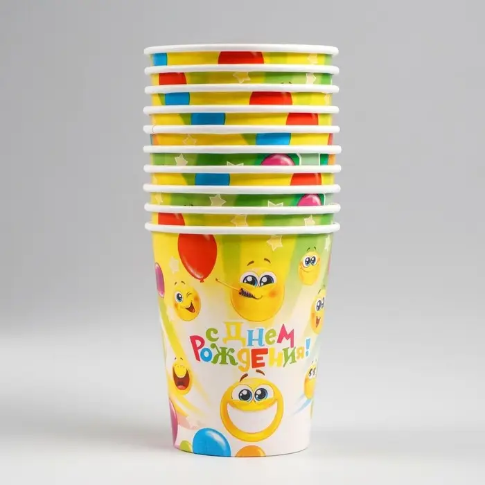 Стакан одноразовый бумажный "С днём рождения!" веселые смайлы, 250 мл
