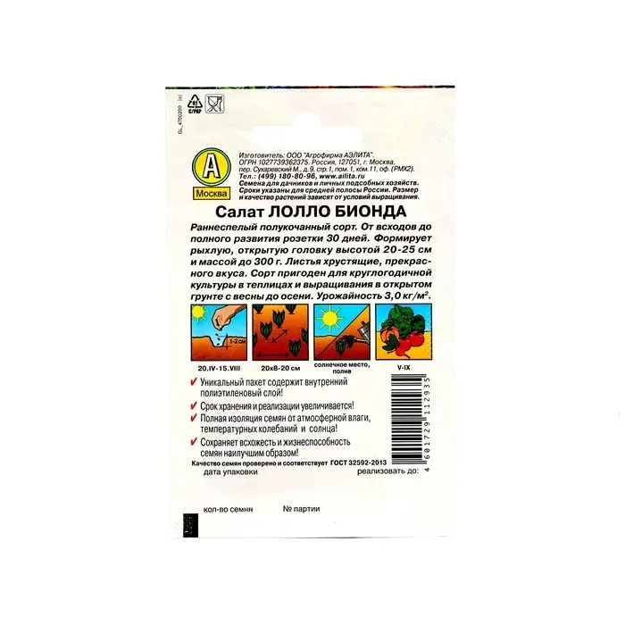 Благодаря внутреннему полиэтиленовому слою пакет не пропускает влагу и увеличивает срок годности семян до 2 лет.