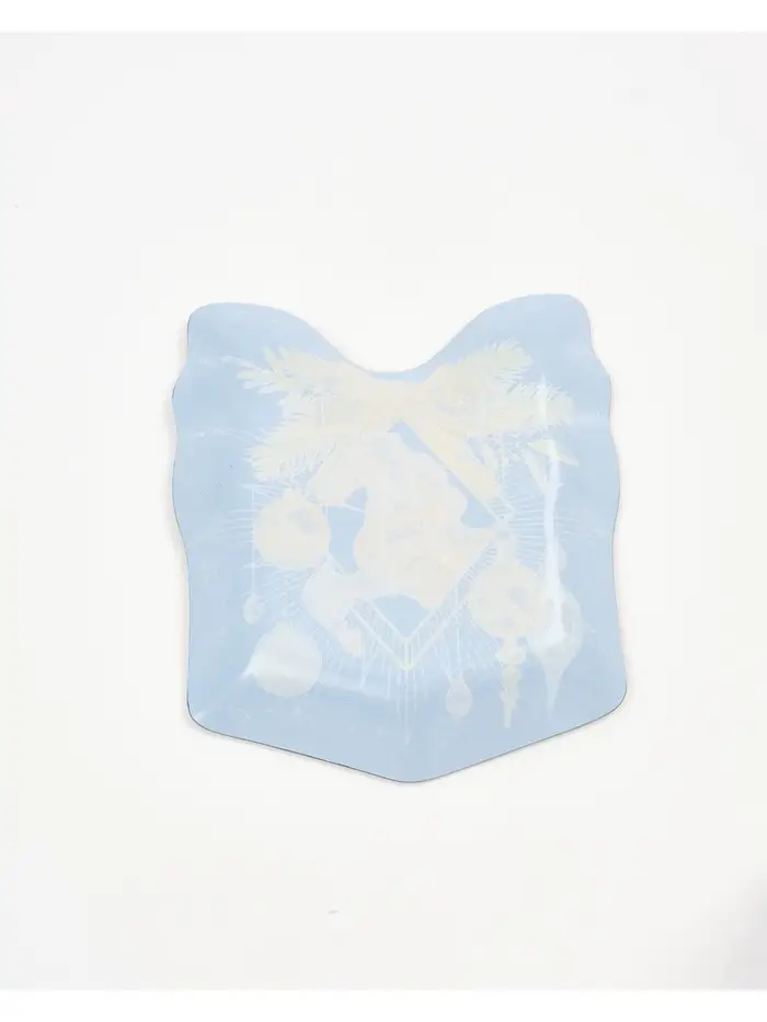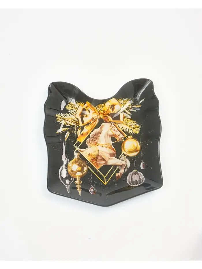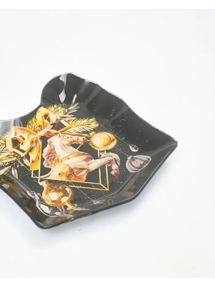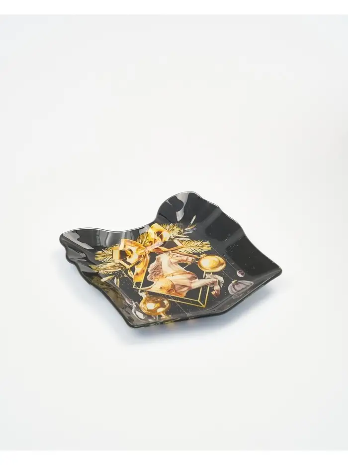 Новогодняя стеклянная тарелка в форме подарка — идеальный выбор для сервировки стола.
