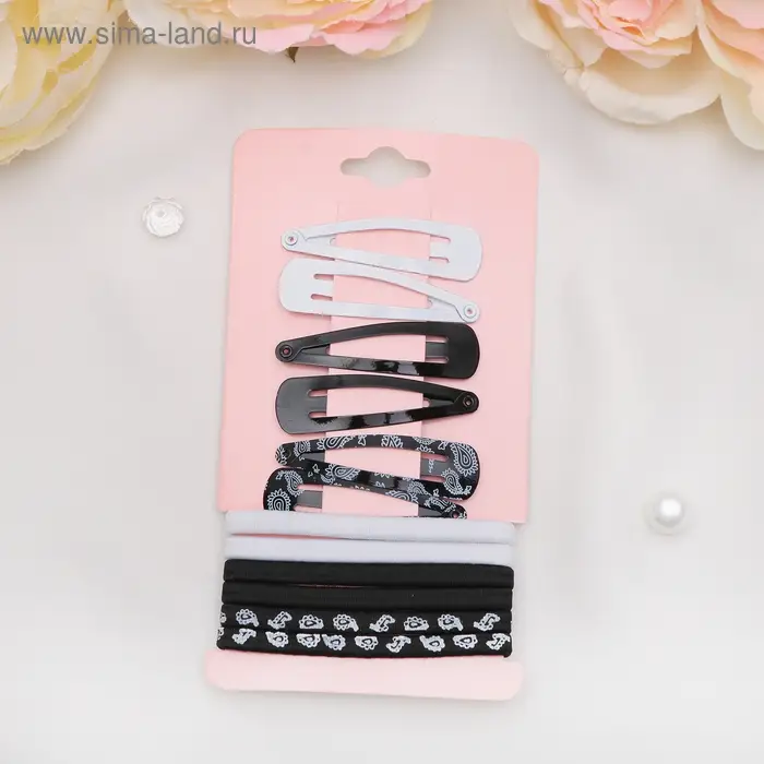 Набор для волос "Прима" (6 резинок, 6 невидимок) чёрно-белые с узором
