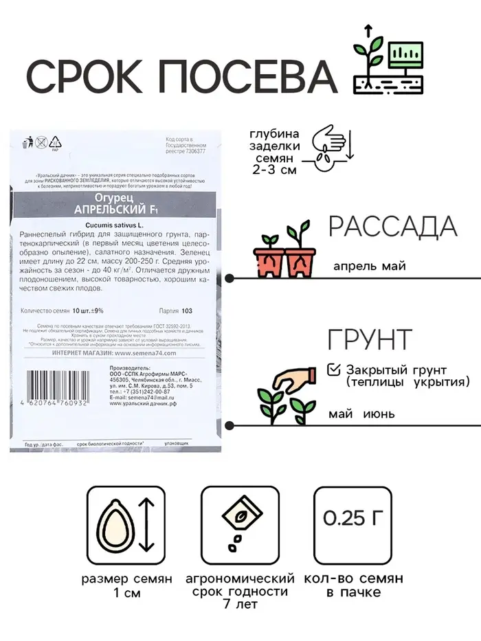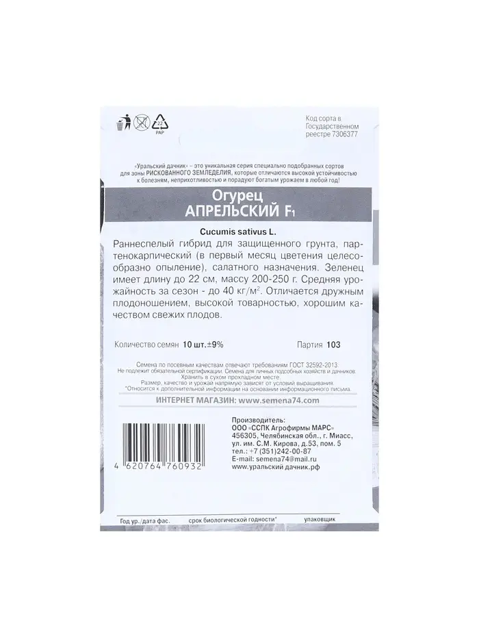 Семена Огурец "Апрельский" F1 раннеспелый, партенокарпический, бп, 0.25 гр