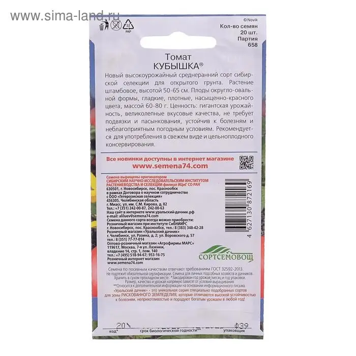Новый высокоурожайный, среднеранний сорт сибирской селекции, для открытого грунта. Растение штамбовое, высотой 50-65 см. Плоды округло-овальной формы, гладкие, плотные, насыщенно – красного цвета, массой 60-80 г. Ценность: гигантская урожайность, великолепные вкусовые качества, не требует подвязки и пасынкования, устойчив к болезням и неблагоприятным погодным условиям.