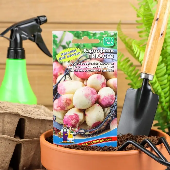 Позднеспелый сорт столового назначения. Период созревания от посадки до сбора урожая 110-130 дней. Название свое получило благодаря необычному окрасу клубней. Пикассо может похвастаться впечатляющей урожайностью, в среднем с 1-га посевов получается не меньше 20 тонн картошки. С одного куста можно собрать до 20 клубней. Клубни округло-овальные. Кожура светло-желтая с характерными розовыми глазками и такими же пятнами вокруг них. Мякоть кремового цвета с небольшим содержанием крахмала — 10-12%. Вкусовые качества у сорта превосходные (5 по пятибалльной шкале) и, более того, сорт обладает длительным периодом сохранности.