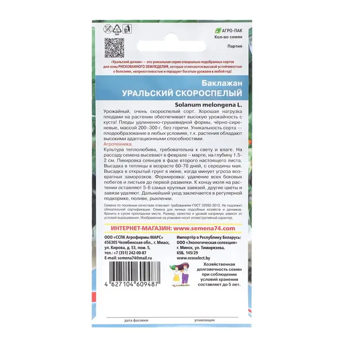 Семена Баклажан "Уральский Скороспелый", 20 шт