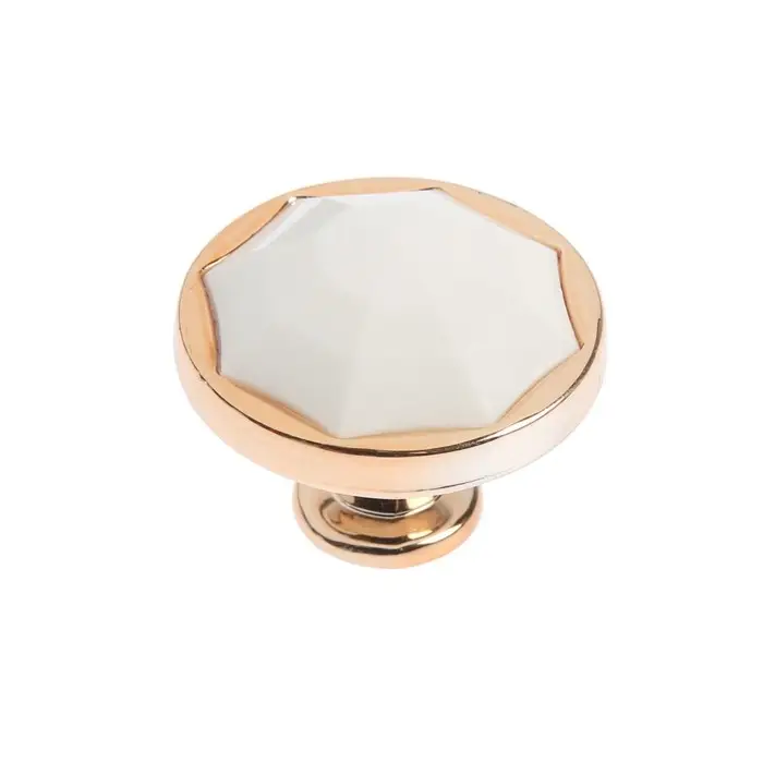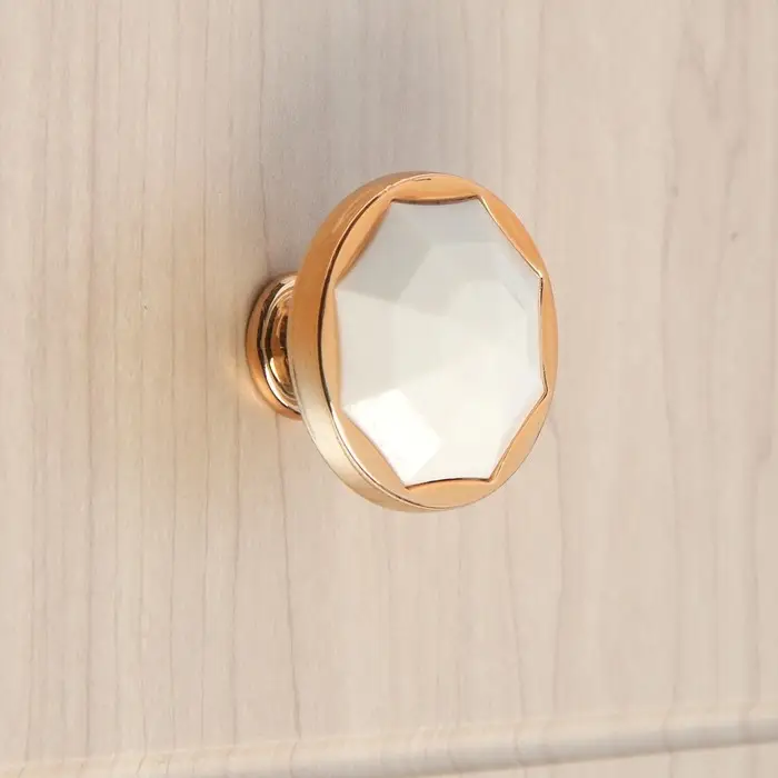 Интересный дизайн ручки сочетается с различными типами мебельного гарнитура. Фурнитура имеет привлекательный внешний вид и компактный размер. Золотой оттенок с белой вставкой идеально подходит к мебельным фасадам в различной цветовой гамме.