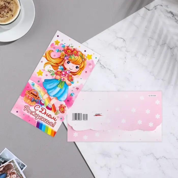 Конверт для денег "С Днём Рождения!" девочка, букет, радуга, 18,5х8,5 см
