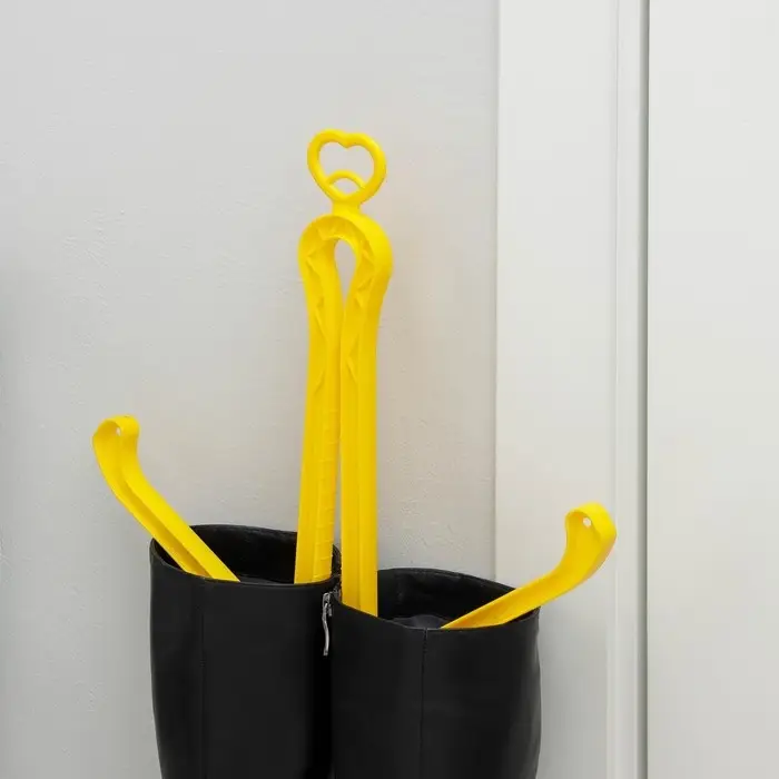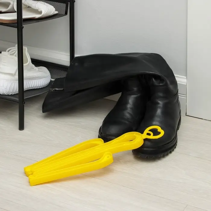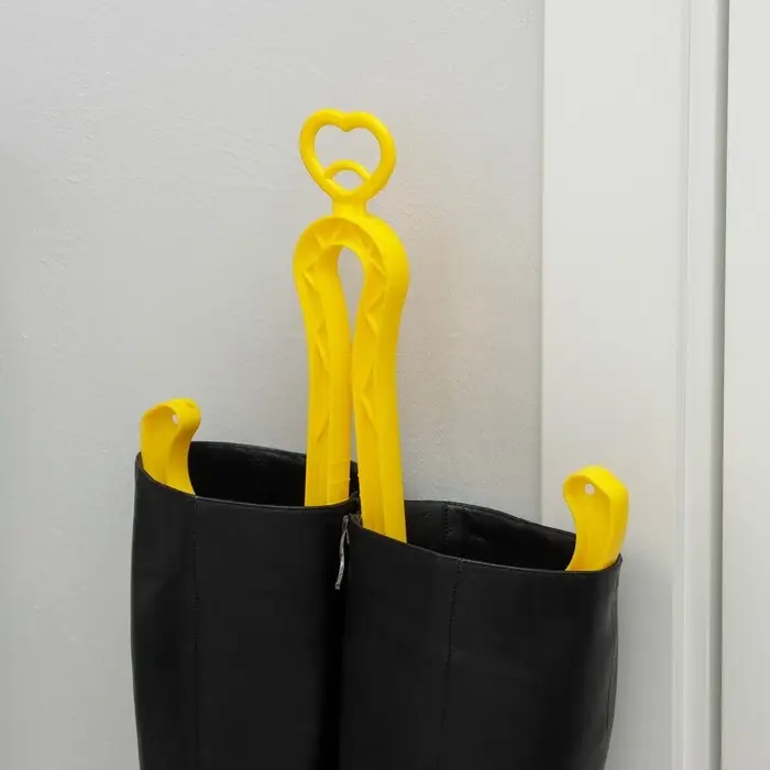 - Организуйте обувь, собрав её по парам. Держатель надёжно соединит между собой два сапога, не дав им коварно расползтись по всей прихожей.