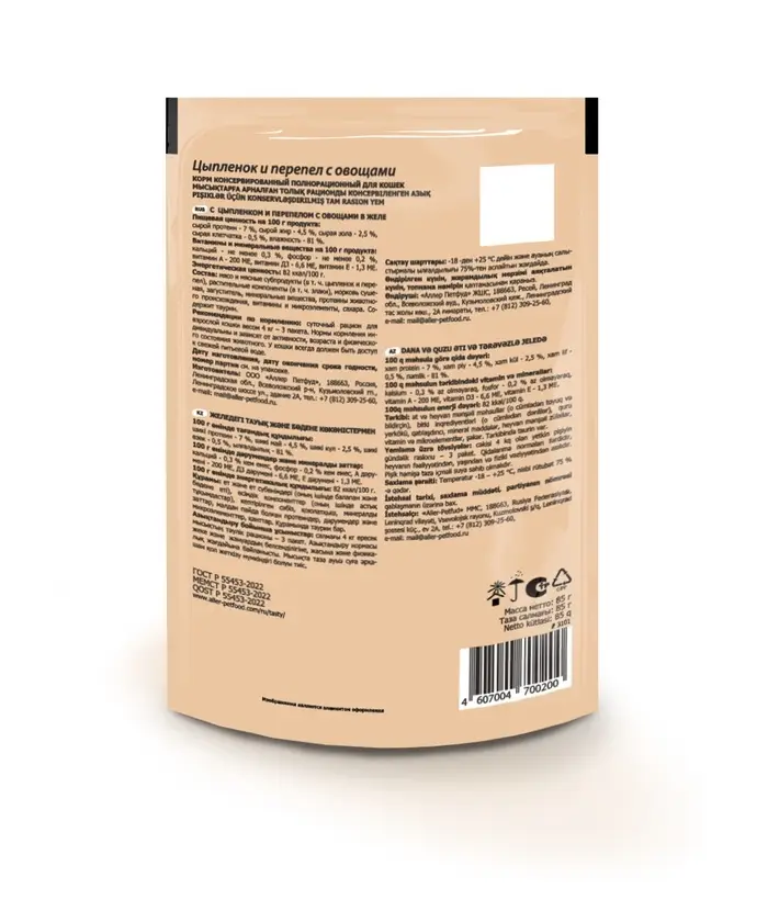 Tasty корм конс. д/кош. с цыпленком, перепелом и овощами в желе, пауч, 85 г
