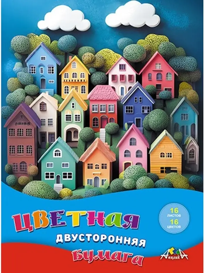 Бумага цветная двусторонний А4, 16 листов, 16 цветов, «Разноцветные домики»