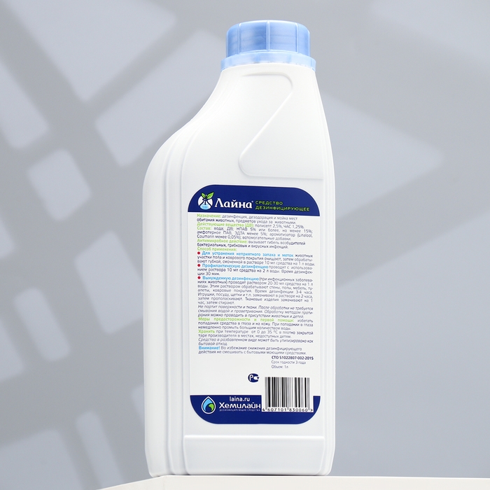 Профессиональное средство "Лайна" для дезинфекции и уборки помещений, 1 л.Обеззараживание, дезодорация и мойка мест обитания животных, предметов ухода за животными.Состав: полисепт, ЧАС, комплекс ПАВ, целевые добавки, вода.Уничтожает возбудителей кишечных, гнойных, грибковых, аденовирусных инфекций, обладает моющими свойствами, устраняет неприятные запахи, не портит поверхность.