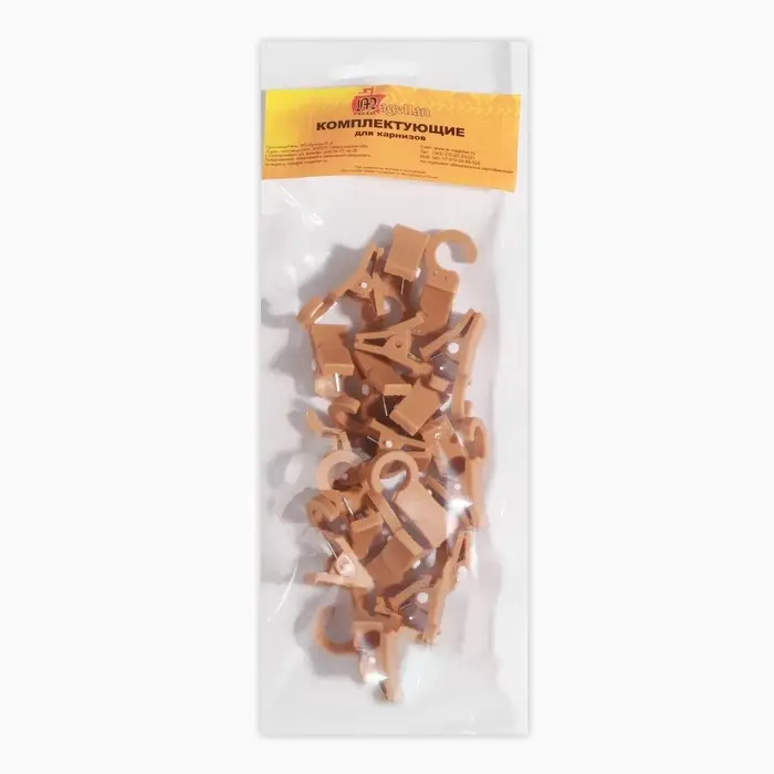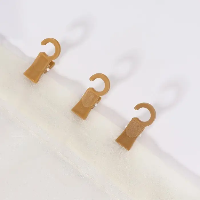 Прочный зажим надёжно зафиксирует ткань, не оставляя затяжек, так как он сделан из мягкого пластика. С одной стороны зажима есть крючок, который крепиться в кольце для карниза.