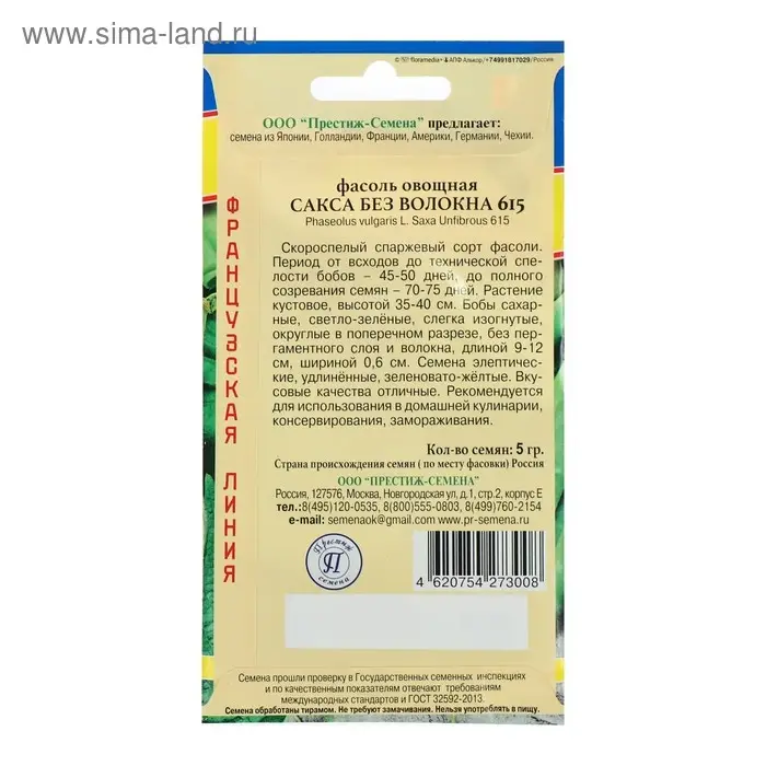 Фасоль Сакса без волокна 615 – вкусный сладкий спаржевый сорт с рано созревающим урожаем! От всходов до первого сбора урожая проходит всего 50 дней. Растение кустовое, высотой 35-40 см. Бобы выровненные, длиной 9-12 см, прекрасных вкусовых качеств, с повышенным содержанием сахаров и витаминов. В створках и швах отсутствует пергаментный слой и волокно. Поэтому приготовленные блюда будут отличаться особенной нежностью вкуса. С подобных сортов очень хорошо приучать детей к вкусной и здоровой пище, ведь они обычно не любят твердые ростки.