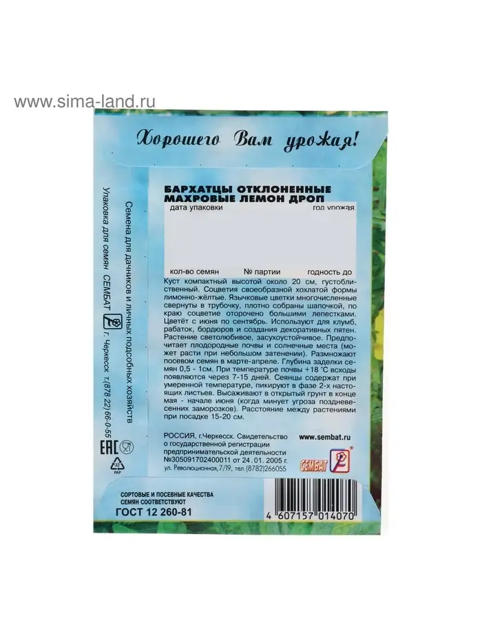 Семена цветов Бархатцы отклоненные "Лемон Дроп", махровые, 0,2 г
