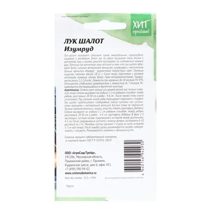 Лук-шалот называют семейным луком, многодальным, сорокозубкой, кущевкой и гнездовым. Этот лук по своим признакам очень близок к репчатому луку и высоко ценится кулинарами за сладковатый и нежный вкус. Отличие от репчатого лука составит в том, что лук-шалот обладает более сильным ветвлением, меньшими луковицами и значительно дольше хранится. Изумруд - раннеспелый полуострый сорт. Луковица округлая, плотная, массой 18-22 г. Сухие чешуи коричневые с розовым оттенком, луковица сочная, белая, трех-четырехзачатковая. Урожайность репки 1,2-1,4 кг/м2. Лежкость при хранении до 10 месяцев 95-97%. Отличается стабильной урожайностью и лежкостью до 7 месяцев. Рекомендуется для выращивания в двулетней культуре.