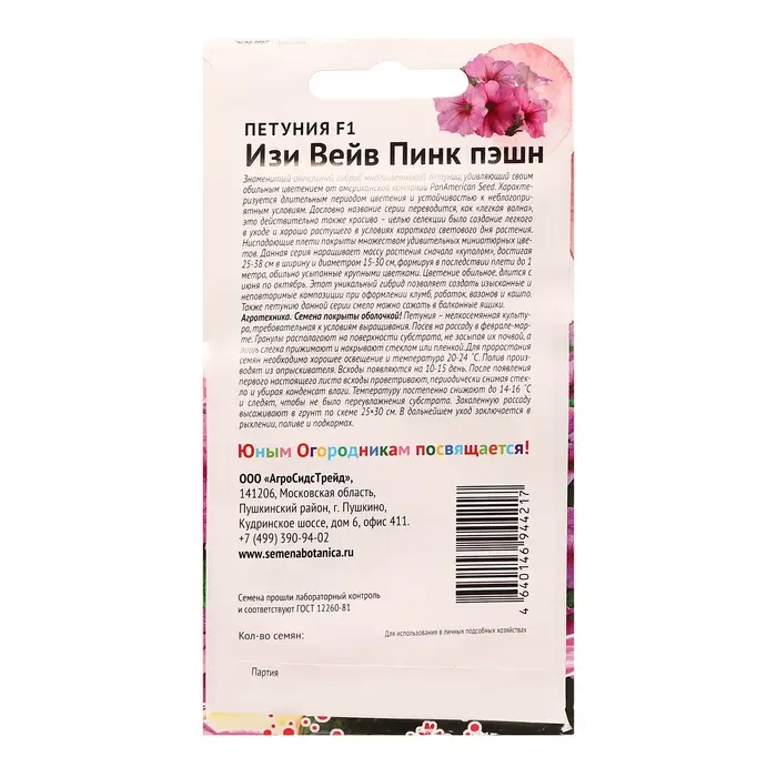 Знаменитый ампельный гибрид многоцветковой петунии, удивляющий своим обильным цветением от американской компании PanAmerican Seed. Характеризуется длительным периодом цветения и устойчивостью к неблагоприятным условиям. Дословно название серии переводится, как «легкая волна», это действительно так же красиво - целью селекции было создание легкого в уходе и хорошо растущего в условиях короткого светового дня растения. Ниспадающие плети покрыты множеством удивительных миниатюрных цветов. Данная серия наращивает массу растения сначала "куполом", достигая 25-38 см в ширину и диаметром 15-30 см, формируя в последствии плети до 1 метра, обильно усыпанные крупными цветками. Цветение обильное, длится с июня по октябрь. Этот уникальный гибрид позволяет создать изысканные и неповторимые композиции при оформлении клумб, рабаток, вазонов и кашпо. Также петунию данной серии смело можно сажать в балконные ящики. Агротехника: Семена покрыты оболочкой! Петуния – мелкосемянная культура, требовательная к условиям выращивания. Посев на рассаду в феврале-марте. Гранулы располагают на поверхности субстрата, не засыпая их почвой, а лишь слегка прижимают и накрывают стеклом или пленкой. Для прорастания семян необходимо хорошее освещение и температура 20-24˚С. Полив производят из опрыскивателя. Всходы появляются на 10-15 день. После появления первого настоящего листа всходы проветривают, периодически снимая стекло и убирая конденсат влаги. Температуру постепенно снижают до 14-16˚С и следят, чтобы не было переувлажнения субстрата. Закаленную рассаду высаживают в грунт по схеме 25×30 см. В дальнейшем уход заключается в рыхлении, поливе и подкормах. Штрих-код –