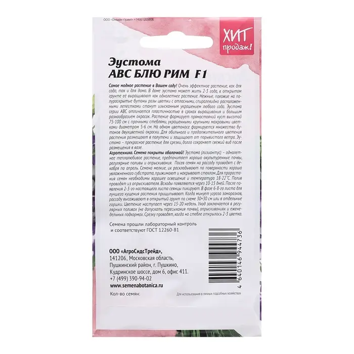 Самое модное растение в Вашем саду! Нежные, похожие на полураскрытые бутоны розы цветки с атласными, спиралевидно расположенными лепестками, станут изысканным украшением любого сада. Эустома серии АВС отличается пластичностью в сроках выращивания и большим разнообразием окрасок. Растение формирует прямостоячий куст высотой 75-100 см с прочными стеблями, украшенными крупными махровыми цветками диаметром 5-6 см. На одном цветоносе формируется множество бутонов ярко-фиолетового цвета. Для обильного и продолжительного цветения растения размещают в полутени и защищают от порывистого ветра. Эустома – прекрасное растение для срезки, долго сохраняет свежий вид после размещения в вазе. Агротехника: Семена покрыты оболочкой! Эустома (лизиантус) – однолетнее, теплолюбивое растение, предпочитает хорошо окультуренные почвы, регулярные поливы и опрыскивания. Посев семян на рассаду проводят с декабря по апрель. Семена мелкие, их раскладывают по поверхности хорошо увлажненного субстрата, прижимают и накрывают стеклом. Для прорастания семян необходимо хорошее освещение и температура 18-22˚С. Полив проводят из опрыскивателя. Всходы появляются через 10-15 дней. После появления 2-3-го настоящего листа сеянцы пикируют. В фазе 6-8 листа для лучшего кущения растения прищипывают. Когда минует угроза заморозков, рассаду высаживают в открытый грунт по схеме 30×30 см или в отдельные горшки. Цветение наступает через 15-20 недель. Уход заключается в регулярных поливах (не допускать пересыхания почвы), опрыскиваниях и еженедельных подкормах. Срезку проводят, когда на стебле открылось 2-3 цветка. Штрихкод -