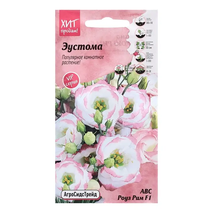 Самое модное растение в Вашем саду! Нежные, похожие на полураскрытые бутоны розы цветки с атласными, спиралевидно расположенными лепестками, станут изысканным украшением любого сада. Эустома серии АВС отличается пластичностью в сроках выращивания и большим разнообразием окрасок. Растение формирует прямостоячий куст высотой 75-100 см с прочными стеблями, украшенными крупными махровыми цветками диаметром 5-6 см. На одном цветоносе формируется множество бутонов ярко-фиолетового цвета. Для обильного и продолжительного цветения растения размещают в полутени и защищают от порывистого ветра. Эустома – прекрасное растение для срезки, долго сохраняет свежий вид после размещения в вазе. Агротехника: Семена покрыты оболочкой! Эустома (лизиантус) – однолетнее, теплолюбивое растение, предпочитает хорошо окультуренные почвы, регулярные поливы и опрыскивания. Посев семян на рассаду проводят с декабря по апрель. Семена мелкие, их раскладывают по поверхности хорошо увлажненного субстрата, прижимают и накрывают стеклом. Для прорастания семян необходимо хорошее освещение и температура 18-22˚С. Полив проводят из опрыскивателя. Всходы появляются через 10-15 дней. После появления 2-3-го настоящего листа сеянцы пикируют. В фазе 6-8 листа для лучшего кущения растения прищипывают. Когда минует угроза заморозков, рассаду высаживают в открытый грунт по схеме 30×30 см или в отдельные горшки. Цветение наступает через 15-20 недель. Уход заключается в регулярных поливах (не допускать пересыхания почвы), опрыскиваниях и еженедельных подкормах. Срезку проводят, когда на стебле открылось 2-3 цветка. Штрихкод -
