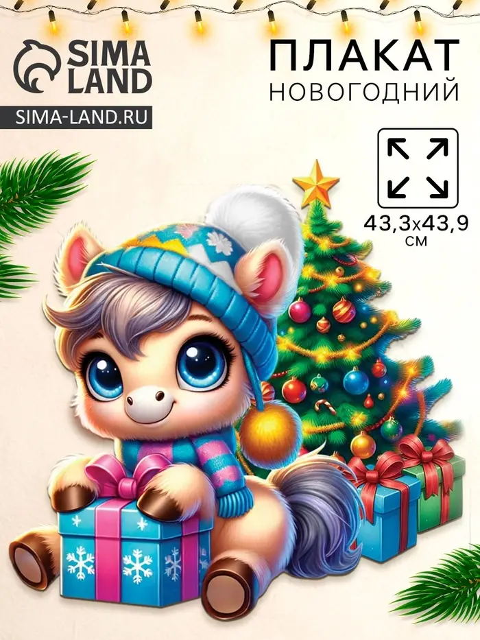 Плакат «С новым годом», лошадка у ёлки, 43,3 х 43,9