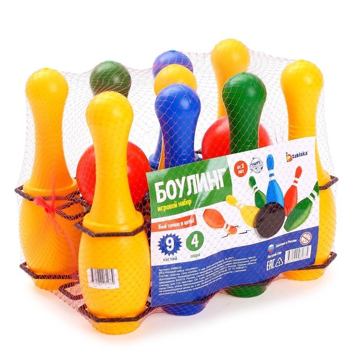 Набор состоит из 9 цветных кеглей и 4 шаров со специальными отверстиями для пальцев.