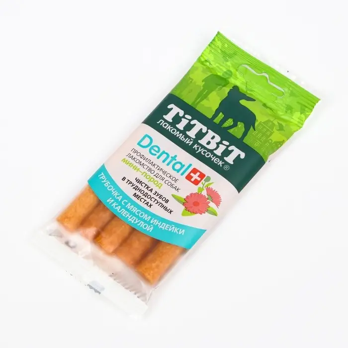 Профилактическое лакомство Dental+ Трубочка с мясом индейки для собак мини-пород содержит экстракт календулы, который обладает дезинфицирующими свойствами. Пористая структура трубочки способствует эффективной чистке зубов собаки в труднодоступных местах.