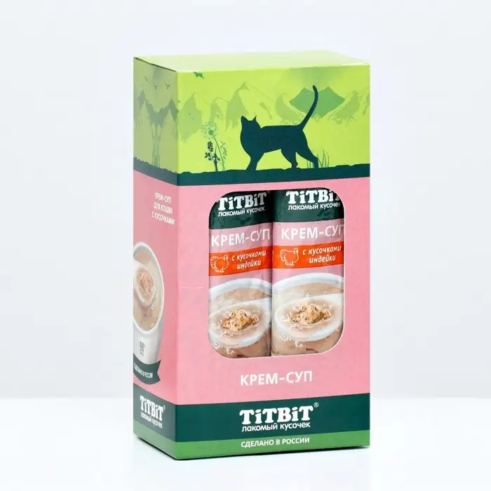 Крем-суп для кошек TITBIT с индейкой – это специально разработанные вкусные и полезные продукты, которые: 1. Содержат кусочки свежего мяса; 2. Содержат 98% мясных ингредиентов; 3. Содержат дополнительные полезные ингредиенты (таурин для поддержки зрения, сердца, пищеварительной, половой и иммунной систем; морковь для поддержки зрения и пищеварения; петрушка для поддержки мочеполовой, сердечно-сосудистой и пищеварительной систем).