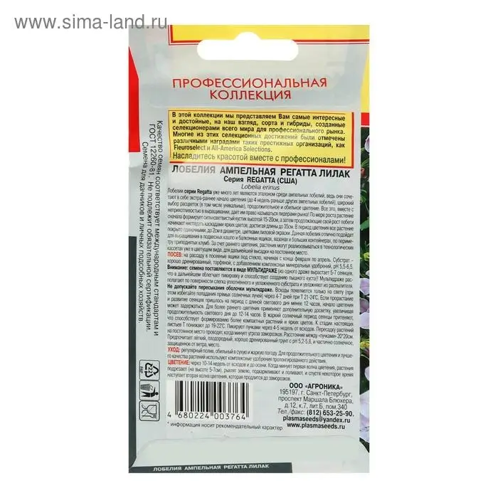 Лобелии серии Regatta уже много лет являются эталоном среди ампельных лобелий, ведь они сочетают в себе экстра-раннее начало цветения (до 4 недель раньше других ампельных лобелий), широкий выбор расцветок (в том числе уникальных), продолжительное и обильное цветение. Все это, вместе с неприхотливостью в выращивании, дает им право называться лидерами рынка! По мере роста растение сначала формирует сильно-ветвистый кустик высотой 15-20см, а затем продолжающие свой рост побеги начинают ниспадать каскадами ярких цветов, достигая длины до 35см. В период цветения все растение покрыто одиночными, до 2см в диаметре, цветками лиловой окраски. Данная лобелия отлично подойдет для выращивания в подвесных кашпо и балконных ящиках, вазонах и больших контейнерах, по периметру приподнятых клумб. За счет раннего цветения, растения могут реализовываться в технологических кассетах уже в цветущем виде, для дальнейшей высадки на постоянное место.