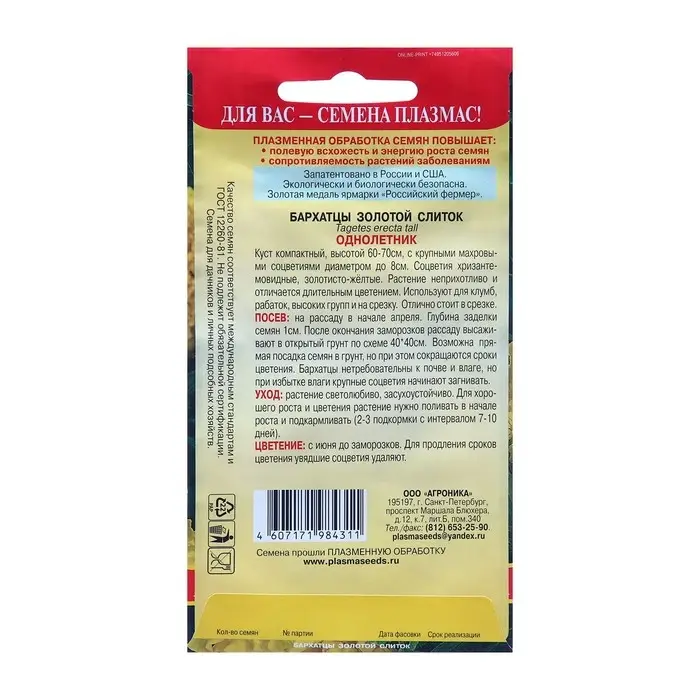 ПОСЕВ: на рассаду в начале апреля. Глубина заделки семян 1см. После окончания заморозков рассаду высаживают в открытый грунт по схеме 40х40 см. Возможна пря- мая посадка семян в грунт, но при этом сокращаются сроки цветения. Бархатцы нетребовательны к почве и влаге.