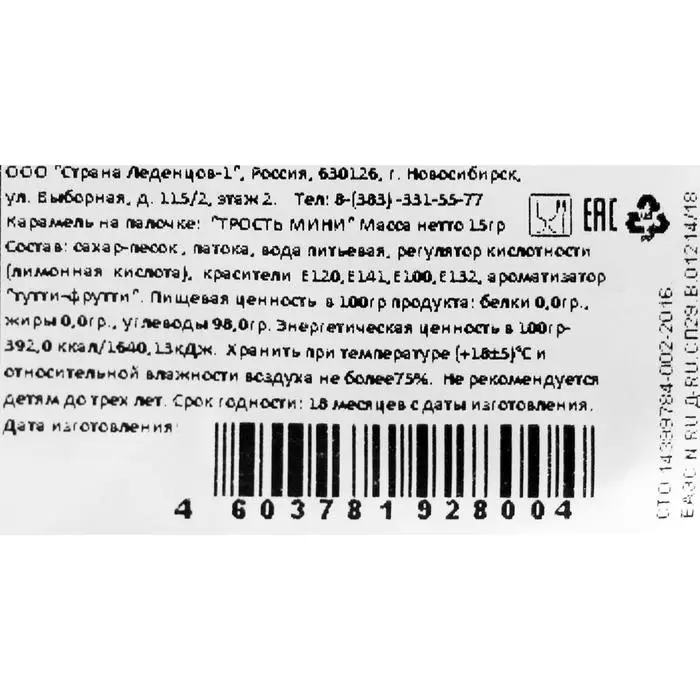 Карамель на палочке новогодняя "Трость мини", 15 г