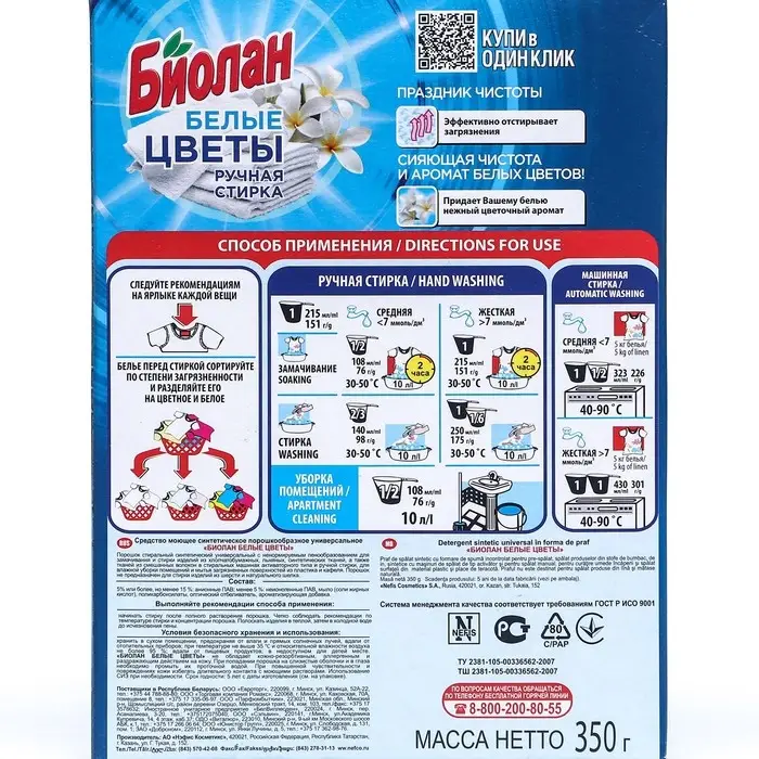 Стиральный порошок "Биолан" Белые цветы, ручная стирка, 350 гр