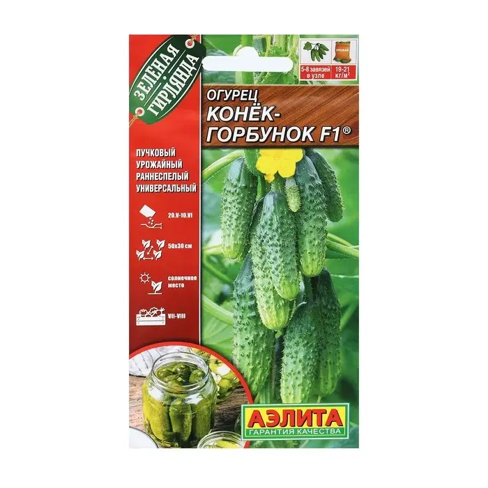 «Конёк-горбунок» — раннеспелый гибридный сорт с рекордной урожайностью. Предназначен для выращивания под плёночными укрытиями. Растение формирует короткие бугорчатые белошипые плоды с насыщенным вкусом без горечи. Гибрид устойчив к болезням культуры.