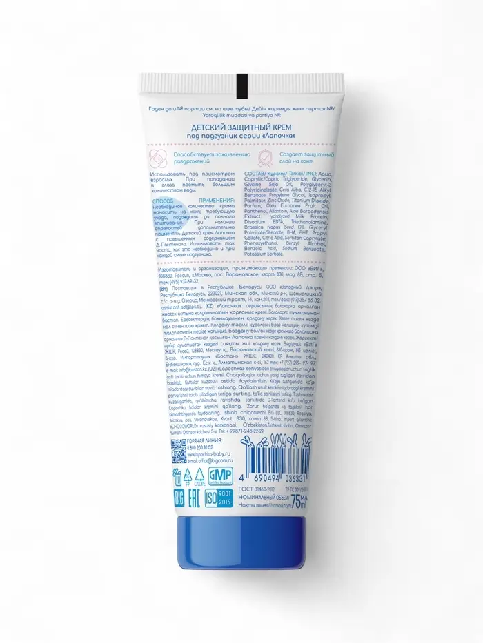 Состав детского крема под подгузник «Лапочка» отличается высоким содержанием натуральных ингредиентов и активных компонентов, этот крем моментально создает защитный слой на коже под подгузником, снимает покраснения и зуд, успокаивает и активизирует защитные функции кожи.