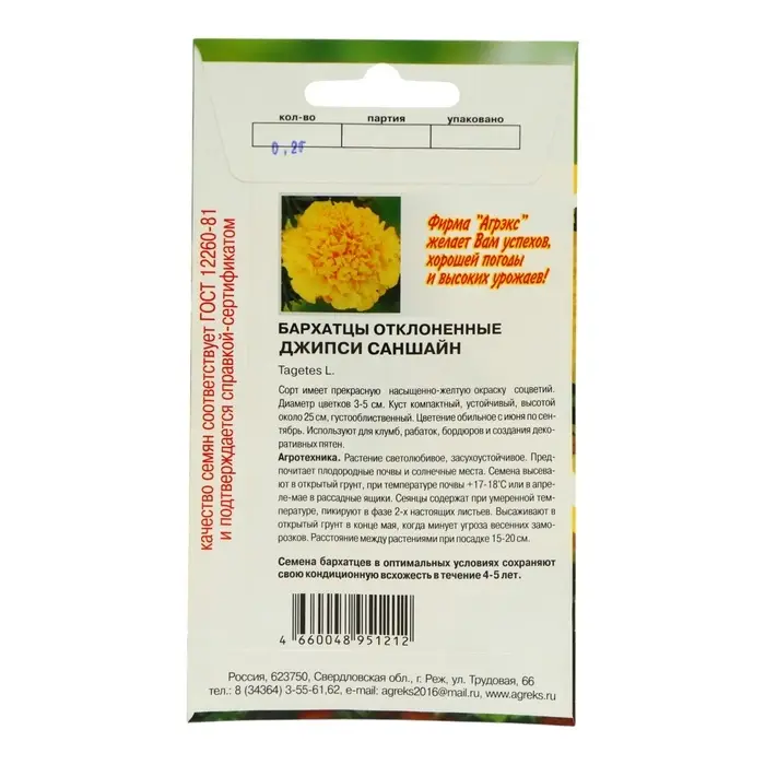 Семена бархатцев отклоненных махровых Джипси саншайн (dzhipsi sanshayn) высевают на рассаду в марте-апреле в парник. На постоянное место высаживают в начале июня. Бархатцы Джипси саншайн цветут с июля по октябрь небольшими (3-4 сантиметра в диаметре) махровыми соцветиями насыщенно-желтой окраски. Высота растения 25 сантиметров. Кустики густые, с темно-зелеными листьями. Используя этот сорт, можно создать красивую желтую лужайку на участке и высветлить солнечным пятном притененные уголки сада.