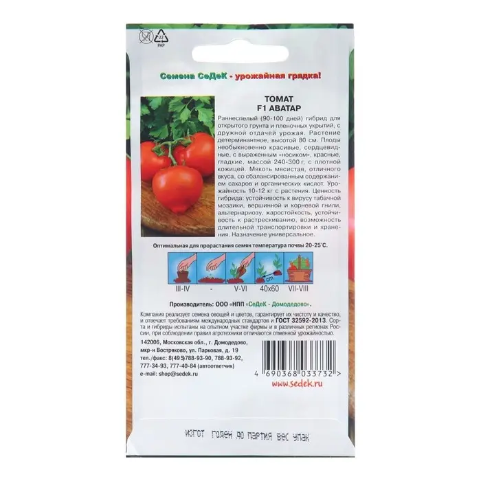 Раннеспелый (90-100 дней) гибрид для открытого грунта и пленочных укрытий, с дружной отдачей урожая. Растение детерминантное, высотой 80 см. Плоды необыкновенно красивые, сердцевидные, с выраженным «носиком», красные, гладкие, массой 240-300г, с плотной кожицей. Мякоть мясистая, отличного вкуса, со сбалансированным содержанием сахаров и органических кислот. Урожайность 10-12 кг с растения. Ценность гибрида: устойчивость к вирусу табачной мозаики, вершинной и корневой гнили, альтернариозу, жаростойкость, устойчивость к растрескиванию, возможность длительной транспортировки и хранения. Назначение универсальное.