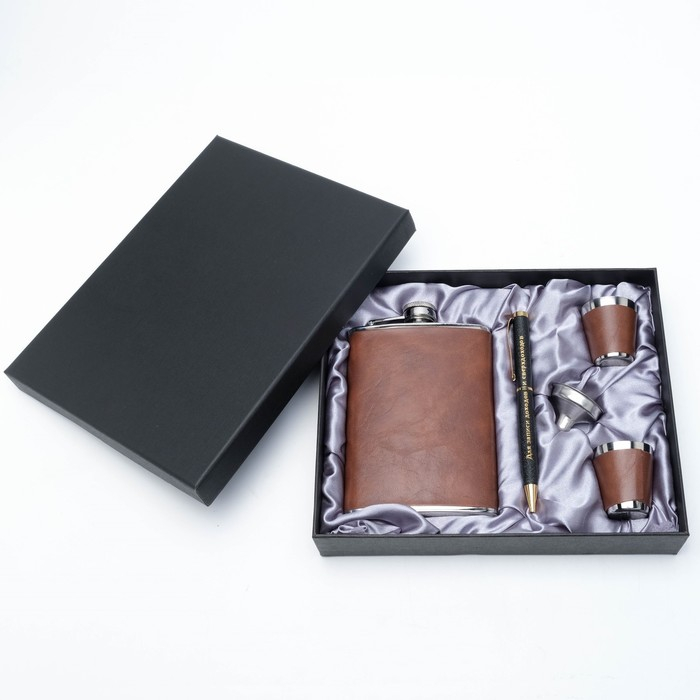 Подарочный набор 5 в 1: фляжка 240 мл, воронка, ручка, 2 рюмки, коричневый, 17 х 21 см