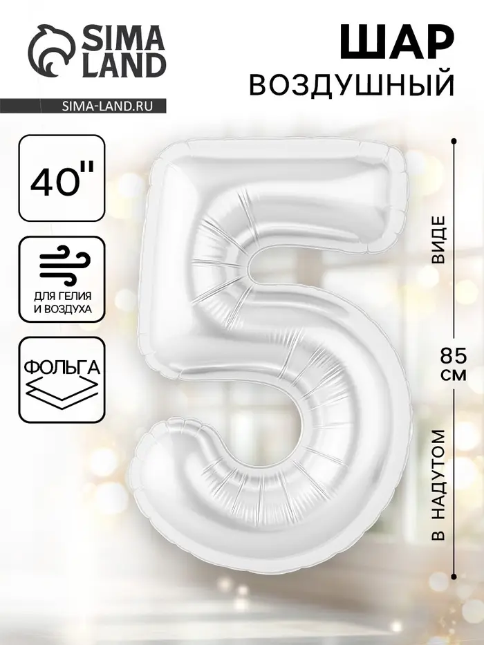 Воздушный шар фольгированный 40" «Цифра 5», белый