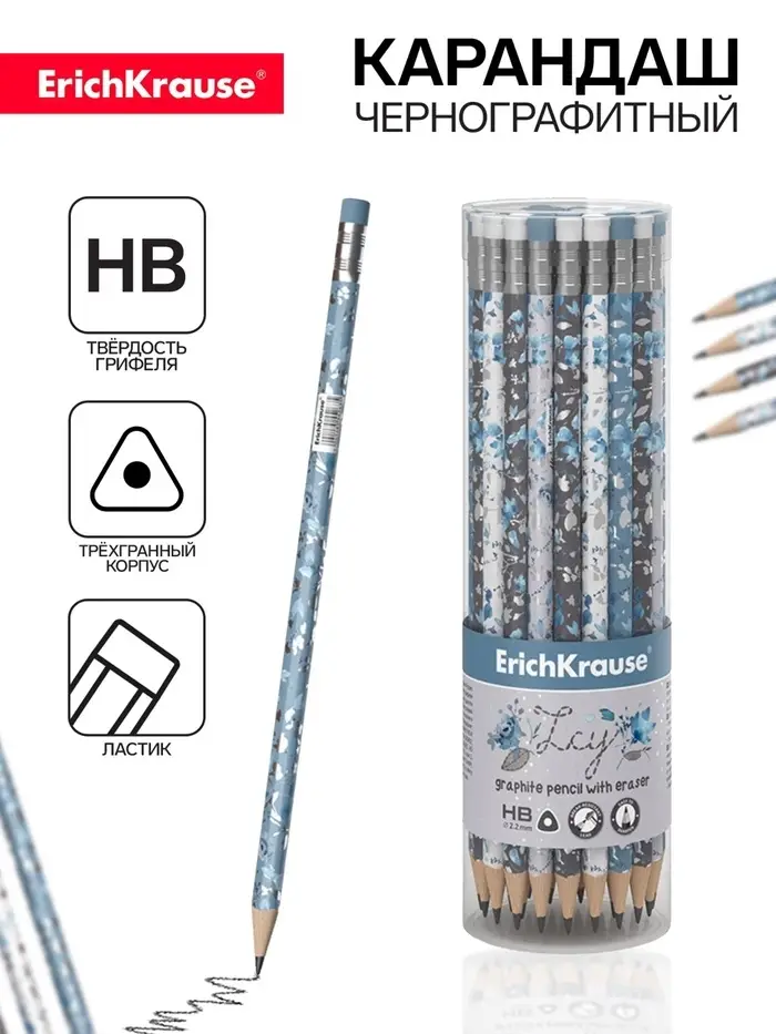 Эргономичный трехгранный чернографитный карандаш с ластиком из отборной древесины, твердость НВ.