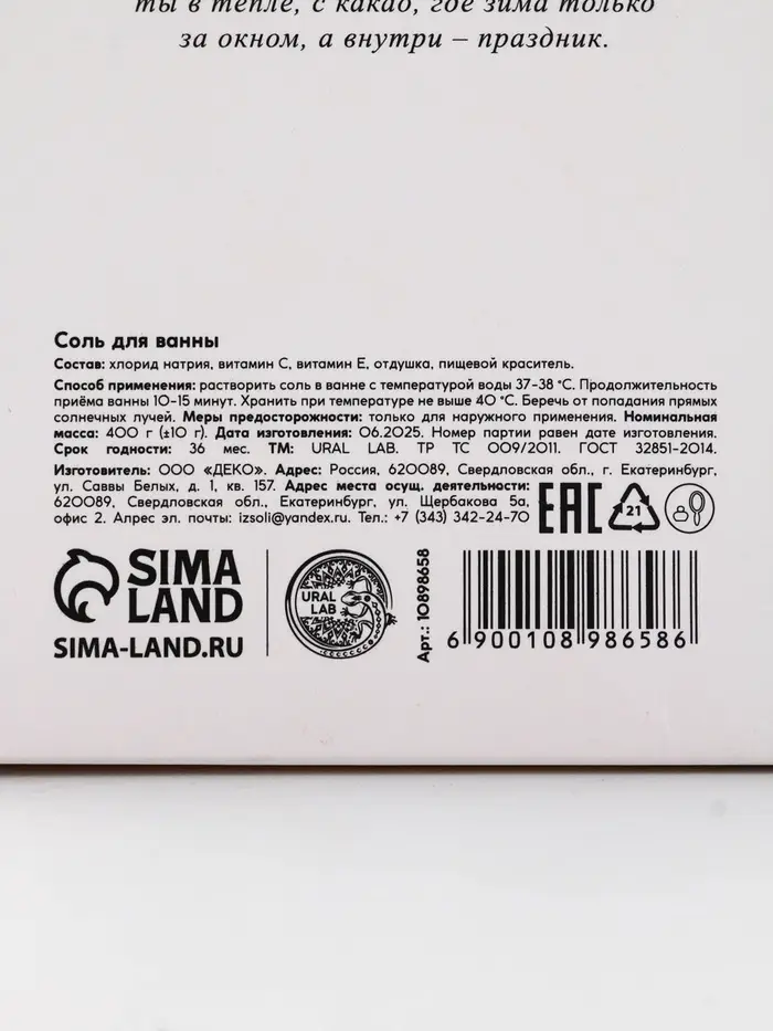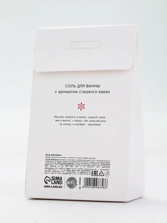 Соль для ванны в коробке, аромат сладкого какао, 400 г, URAL LAB