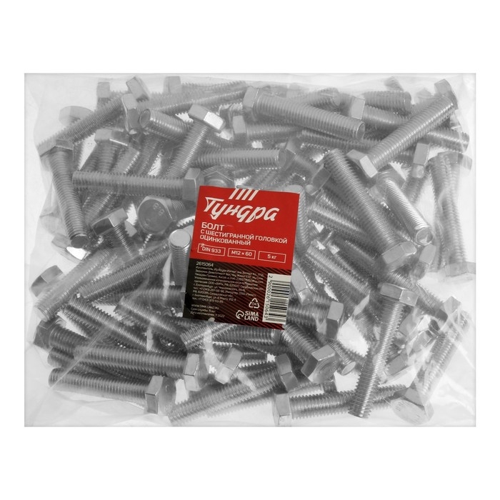 Болт ТУНДРА, оцинкованный, DIN 933, класс прочности 8.8, М12х60 мм, 5 кг