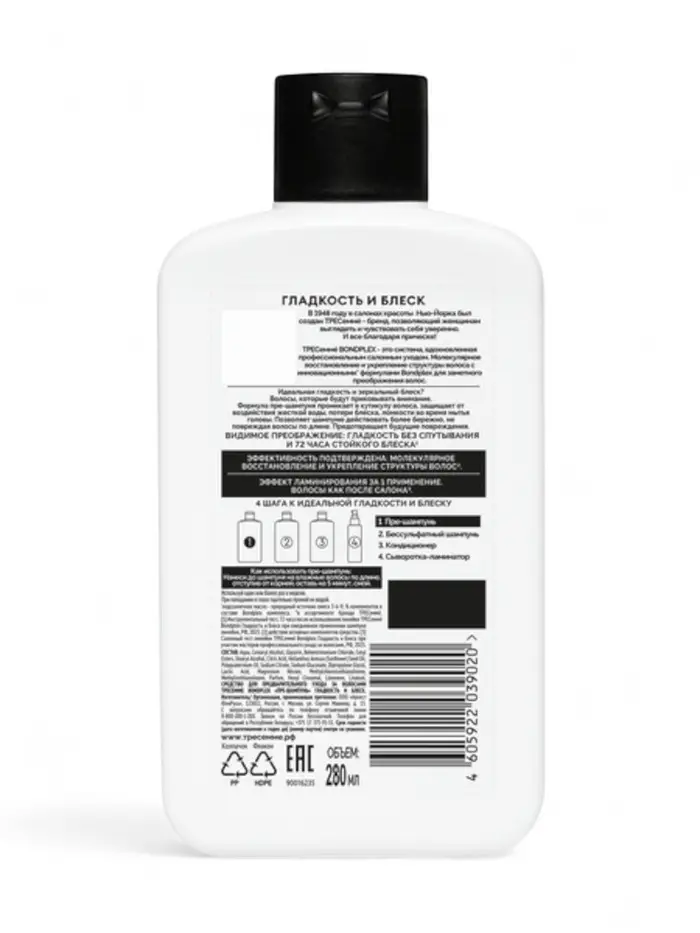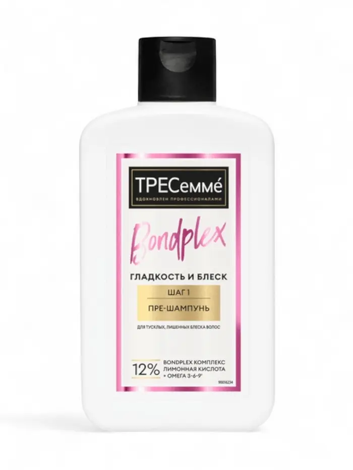 Пре-шампунь для волос ТРЕСеммé Bondplex — это эффективное средство для ухода за тусклыми и лишенными блеска волосами. Формула на основе Bondplex - комплекса с лимонной кислотой и омега 3-6-9 восстанавливает структуру локонов, укрепляет их и обеспечивает эффект ламинирования.