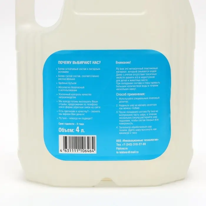 Способ применения: используйте специальный помповый дозатор. Наденьте шар на насадку дозатора как можно глубже. После попадания состава во внутреннюю часть шара, в течение нескольких секунд растирайте шар ладонями, чтобы состав покрыл всю поверхность. Заполните обработанный шар гелием. Дайте шару высохнуть как минимум 2 часа.