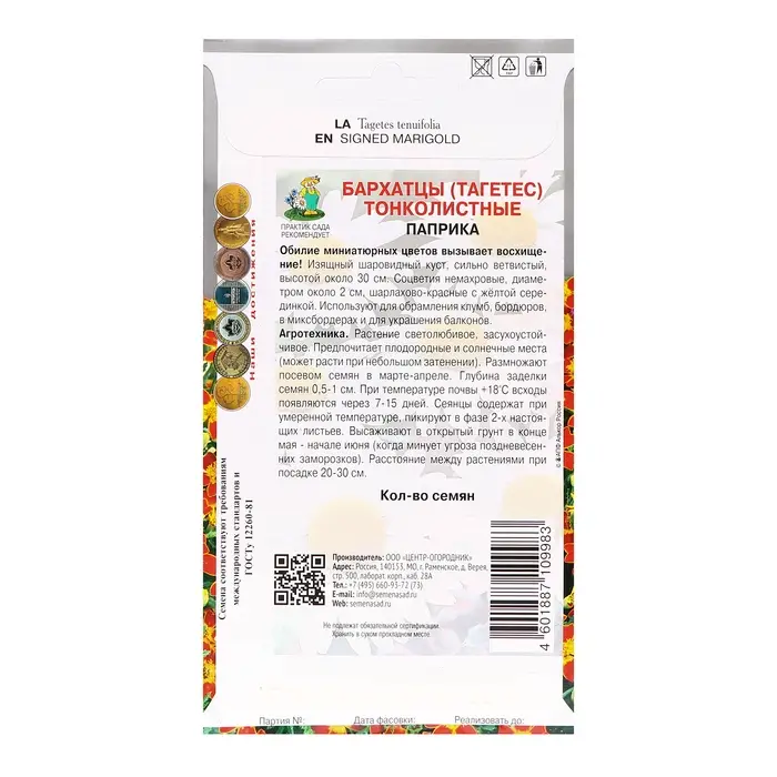 Обилие миниатюрных цветов вызывает восхищение! Изящный шаровидный куст, сильно ветвистый, высотой около 20-25 см. Соцветия немахровые, диаметром около 2 см, шарлахово-красные с жёлтой серединкой. Используют для обрамления клумб, бордюров, в миксбордерах и для украшения балконов.Агротехника. Растение светолюбивое, засухоустойчивое. Предпочитает плодородные и солнечные места (может расти при небольшом затенении). Размножают посевом семян в марте-апреле. Глубина заделки семян 0,5-1 см. При температуре почвы +18°С всходы появляются через 7-15 дней. Сеянцы содержат при умеренной температуре, пикируют в фазе 2-х настоящих листьев. Высаживают в открытый грунт в конце мая - начале июня (когда минует угроза поздневесенних заморозков). Расстояние между растениями при посадке 20-30 см. Семена соответствуют требованиям международных стандартов и ГОСТу РФ 12260-81