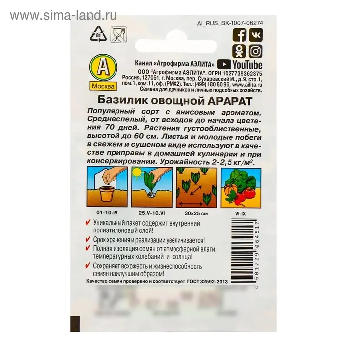 Семена Базилик овощной «Арарат» «Лидер», пряность, 0.2 г