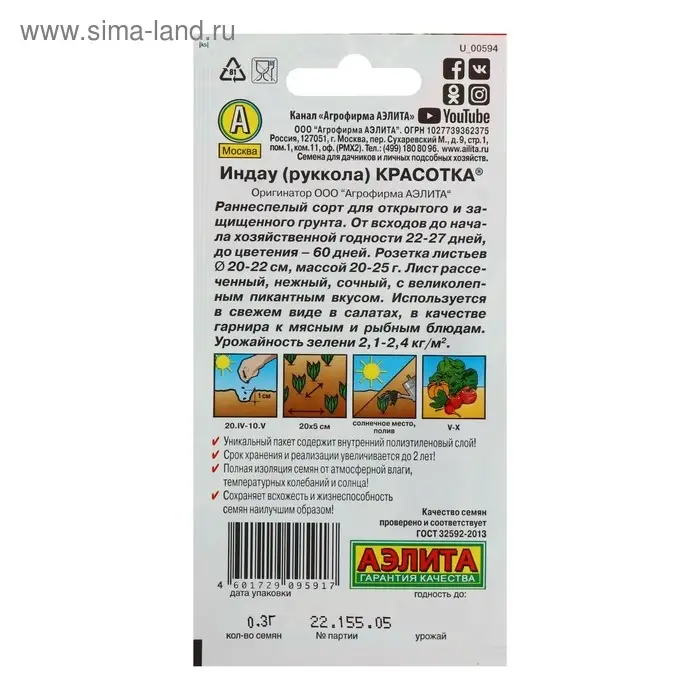 Семена Индау (рукола) «Сицилия», 0.3 г, «Аэлита»