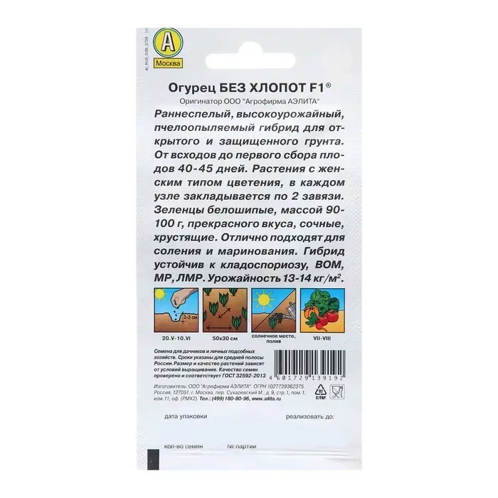 Семена Огурец "Без хлопот" F1, пчелоопыляемый гибрид, 0,25 г