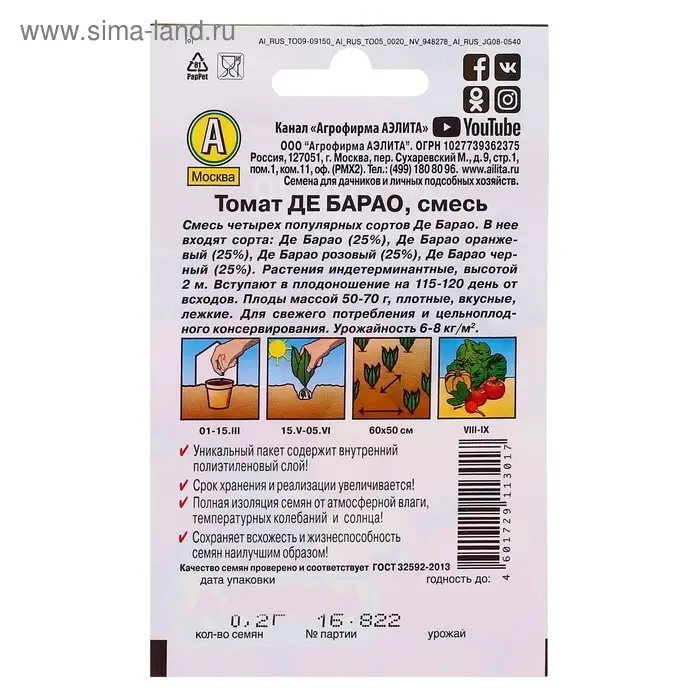 Благодаря внутреннему полиэтиленовому слою пакет не пропускает влагу и увеличивает срок годности семян до 2 лет.