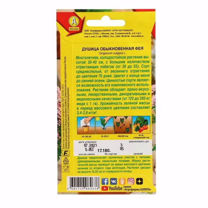 Семена Душица обыкновенная "Фея", ц/п, 0,05 г